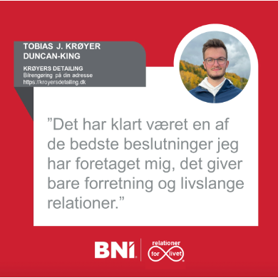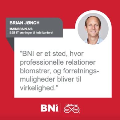 BNI står for Business Network International. Vi er en global forretningsorganisation, som vil forbedre den måde, verden gør forretninger på. Det gør vi ud fra princippet om Givers Gain - at den, der giver, får tilbage. I vores stærke forretningsteams skaber BNI-partnerne langsigtigede og tillidsfulde relationer til hinanden. Det gør, at partnerne bedre kan anbefale teamkollegaerne til deres netværk og på den måde skabe flere forretningsmuligheder til hinanden. BNIs koncept er gennemprøvet og baseret på en struktureret tilgang til referencemarkedsføring.
